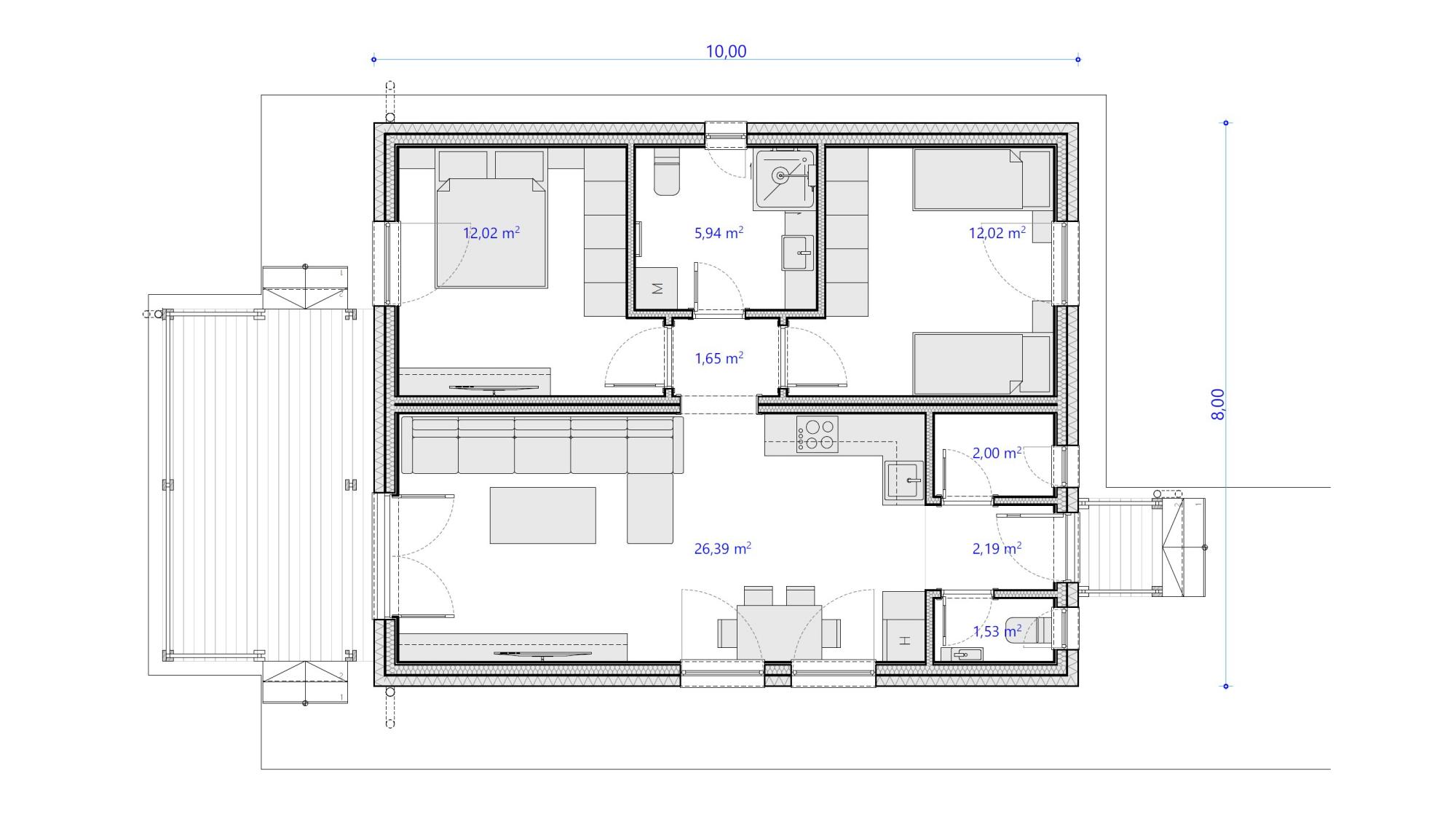 A házban két különálló hálószoba és egy tágas, egyterű közösségi zóna (nappali-konyha-étkező) kapott helyet. A modern, négy évszakos kivitelnek és a már az alapárban is szereplő, 15 m²-es fedett terasznak köszönhetően ez az otthon valódi kényelmet és élhető tereket biztosít az év minden napján.