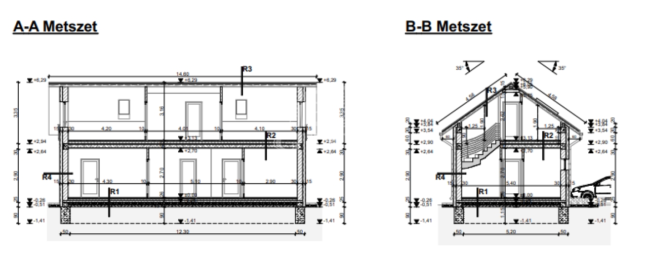 Házanként nappali+4 szoba kerül kialakításra, fürdőszoba mindkét szinten megtalálható.