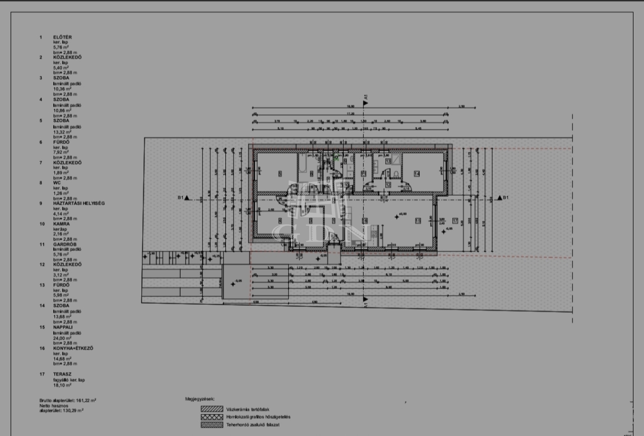 560 nm-es telken egy nettó 130 nm-es ,( bruttó 161 nm ) Amerikai konyhás nappali 38,68 nm), előtér, kamra, 4 szoba (10,36 + 10,86 + 13,32 + 13,68 nm), gardrób, közlekedő, wc, háztartási helyiség, 2 fürdő + 18,10nm terasz.