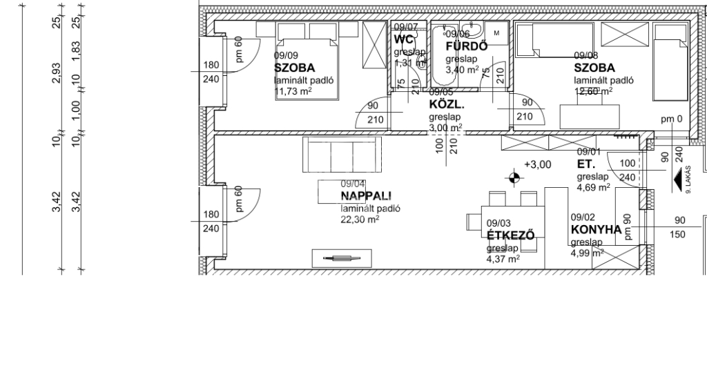 A projekt 9. számú, első emeleti lakása nettó 69 m2 lakóterületű (bruttó 70m2). A jól átgondolt terveknek köszönhetően a lakás elosztása kiváló, a terek kialakításánál a funkcionalitás dominált, kényelmes életteret biztosítva leendő lakóinak.