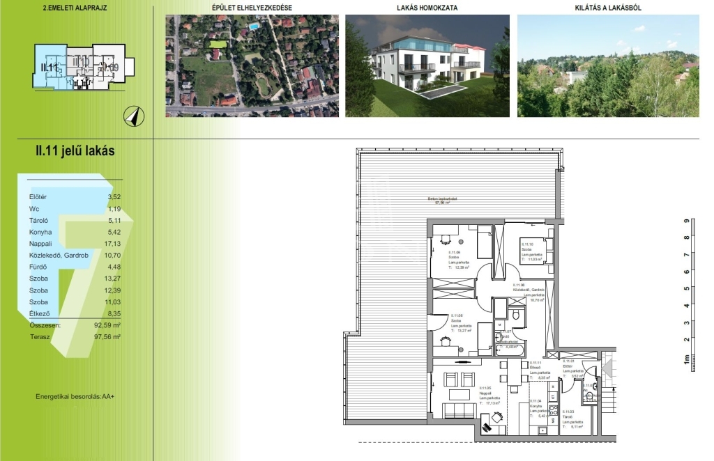 -II.11 lakás: 92,59 m²; terasz: 97,56 m²; ár: 119.600.000.- Ft.