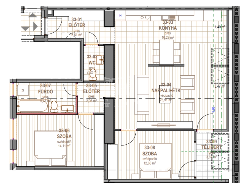 Az enteriőrt személyre szabottan alakítjuk ki, így otthonod megfelel az igényeidnek és kifejezi egyediségedet .Az apartman három hálószobához kétl fürdőszoba tartozik, valamint egy 2,4m2-es loggia is. A pontos beosztás az alaprajzon látható.