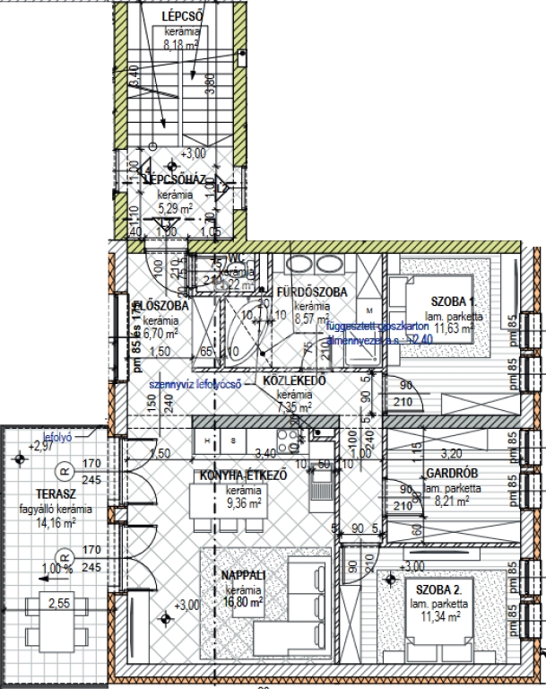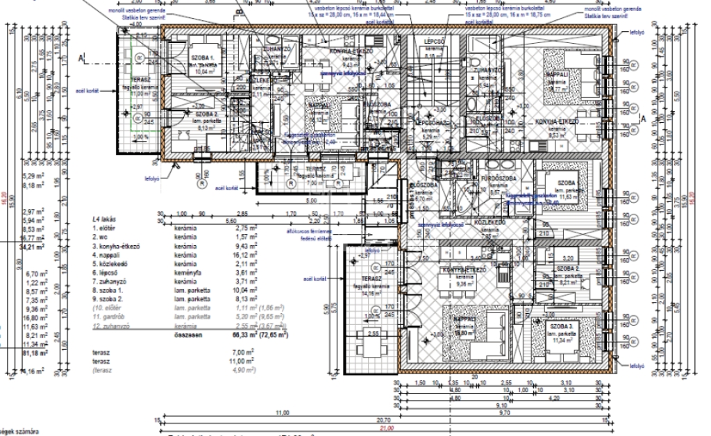 Szombathely belvárosában, a ” költők utcái ” városrészen csendes, átmenő forgalomtól mentes utcában hat lakásos társasházban, prémium kategóriás lakások, közös kertkapcsolattal eladók. Az ingatlanban mindenki számára alkalmas lakások épülnek. Egy szobástól - négy szobásig, 34 m2 - 86 m2 között. Különlegessége, hogy az első emeleti egyik lakása belső kétszintes. Az ingatlan magas műszaki tartalommal készül. A lakásokat elválasztó falazat hanggátló téglából épül. Homlokzatára 15 cm vastag EPS szigetelés kerül, dryvit vakolattal. Műanyag, fokozottan hang-és hőszigetelt nyílászárói kívül barna, belül fehér színű tokszerkezettel 3 rétegű üvegezéssel készül, redőnyökkel felszerelve. A tetőtérben Fakro ablakokra tervezett, hővédő árnyékolókkal. A fűtés, meleg vízellátás a mai kor követelményeinek leginkább megfelelő házközponti LG hőszivattyús fűtésrendszer kerül kialakításra, H tarifával, minden helyiségben padlófűtéses hőleadással. Napi és heti programozású digitális termosztátokkal. A fürdőszobákban a padlófűtés mellett, törölköző szárítós radiátorok lesznek kialakítva. A lakások nappalijában hűtő-fűtő klíma kerül. Villanyhálózata 3 x 16 Amper teljesítményű. Választható hideg-meleg burkolatok, szaniterek, csaptelepek, beltéri ajtók. Zárt, parkosított udvarában felszíni parkolók, fedett gépkocsibeállók vásárolhatók. Az ingatlan klasszikus, igényes külső megjelenése belvároshoz méltó. A hirdetésben szereplő lakás L3-as, 81.18 m2, +14.16 m2 terasz. Első emeleti, 4 szobás lakás, kertre néző terasszal.