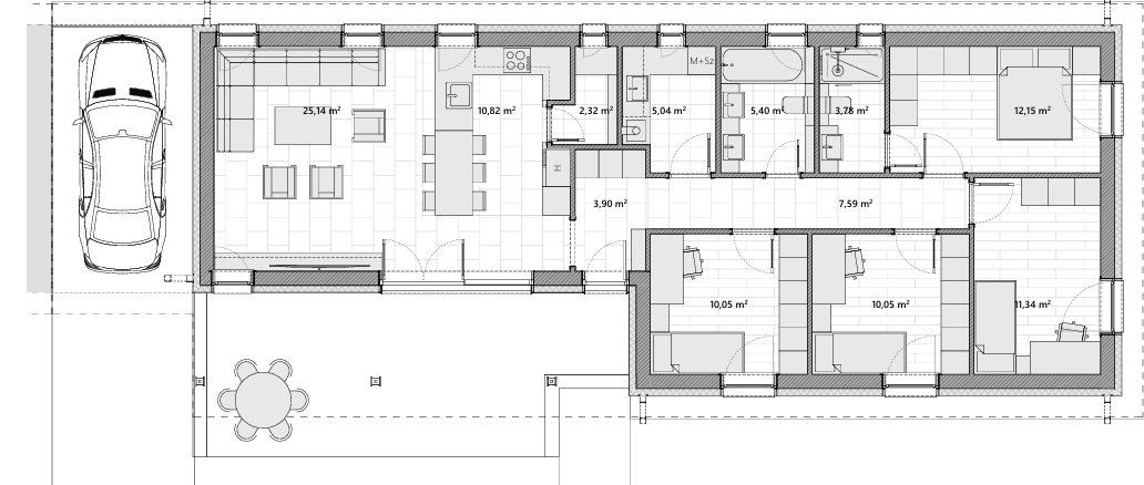 Tágas Közösségi Terek: A ház szíve egy nagy, egybenyitott nappali-étkező-konyha zóna, amely ideális a közös étkezésekhez, a hétvégi társasjátékokhoz és a nagy családi ünnepekhez. Elegendő teret biztosít a közös programokhoz anélkül, hogy bárki is szűkösen érezné magát.
