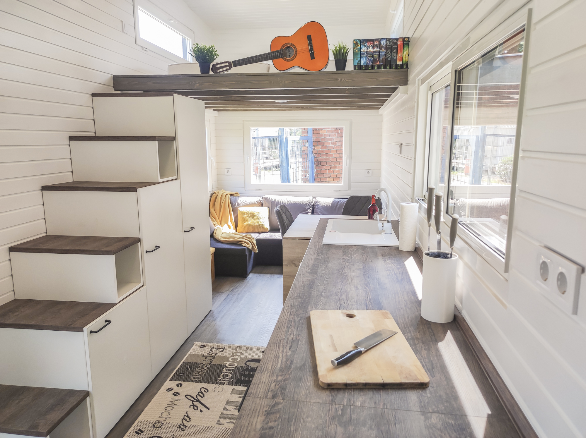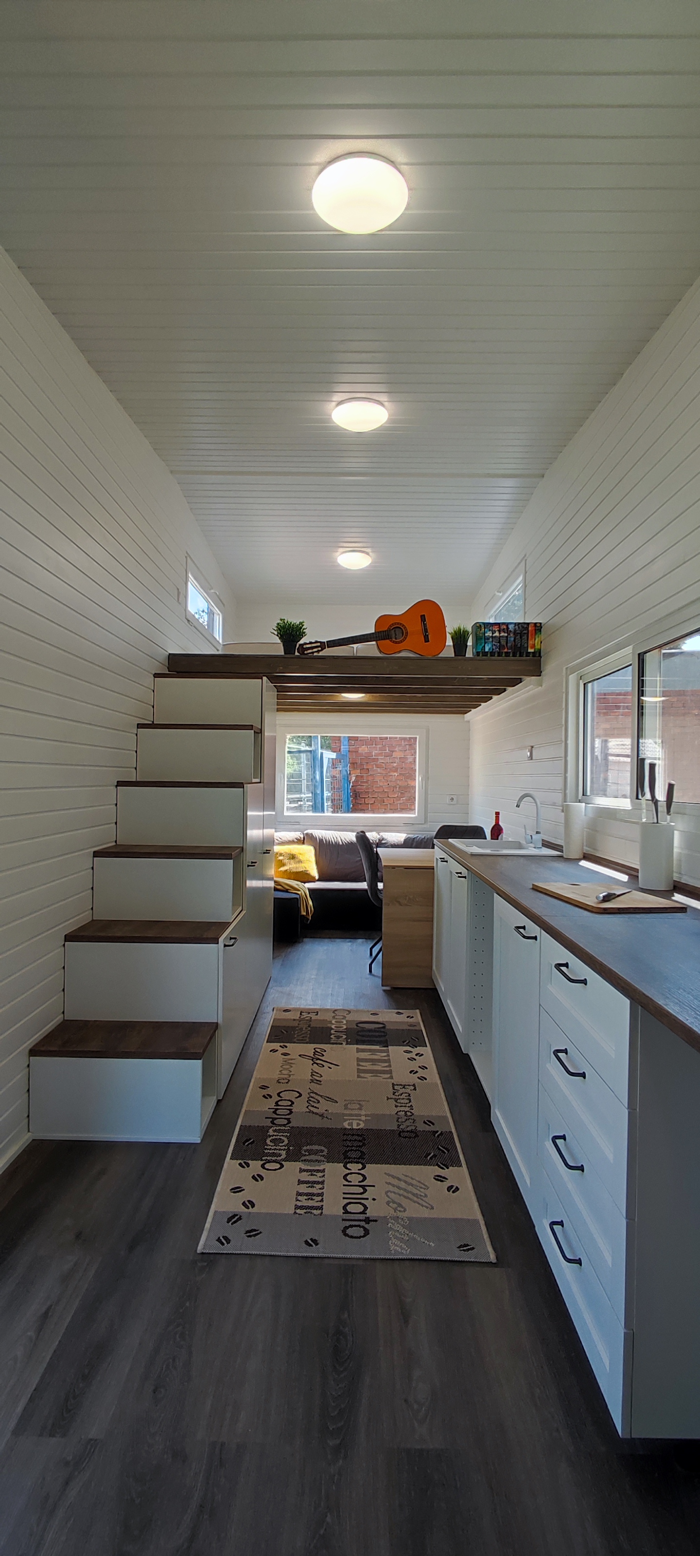 Ez a menő Tiny House az igényes minimalizmus és a modern technológia találkozása: letisztult formák, prémium anyagok és minden kényelmi funkció, amire egy kompakt lakótérben vágyhatunk.
