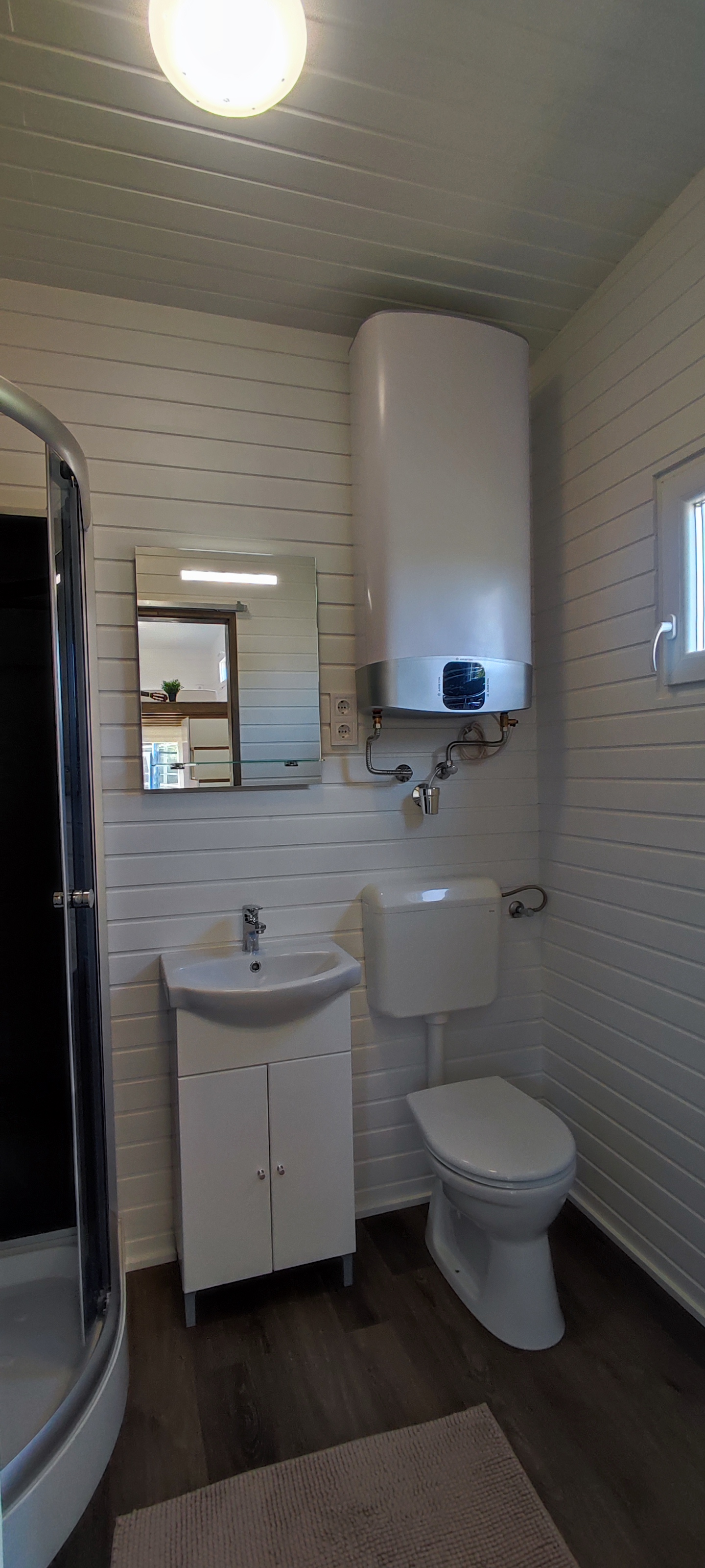 - Komfortos fürdőszoba: 90×90 cm zuhanykabin, 80 L-es villanybojler, szellőző elszívó és mosdószekrény.
