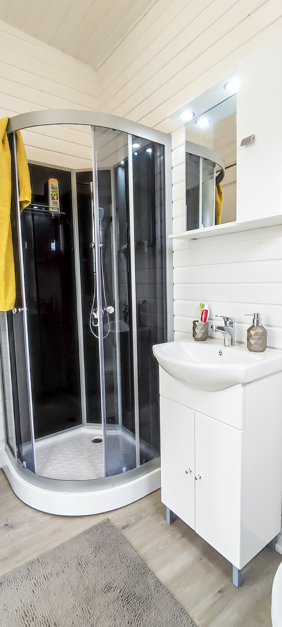 A fürdőszoba zuhanykabinnal, WC-vel és mosdóval felszerelt.