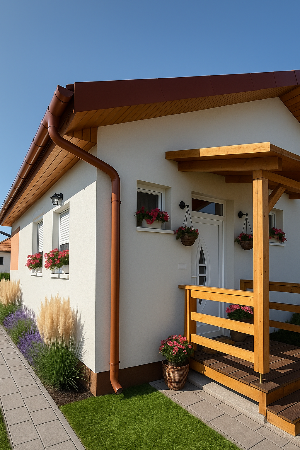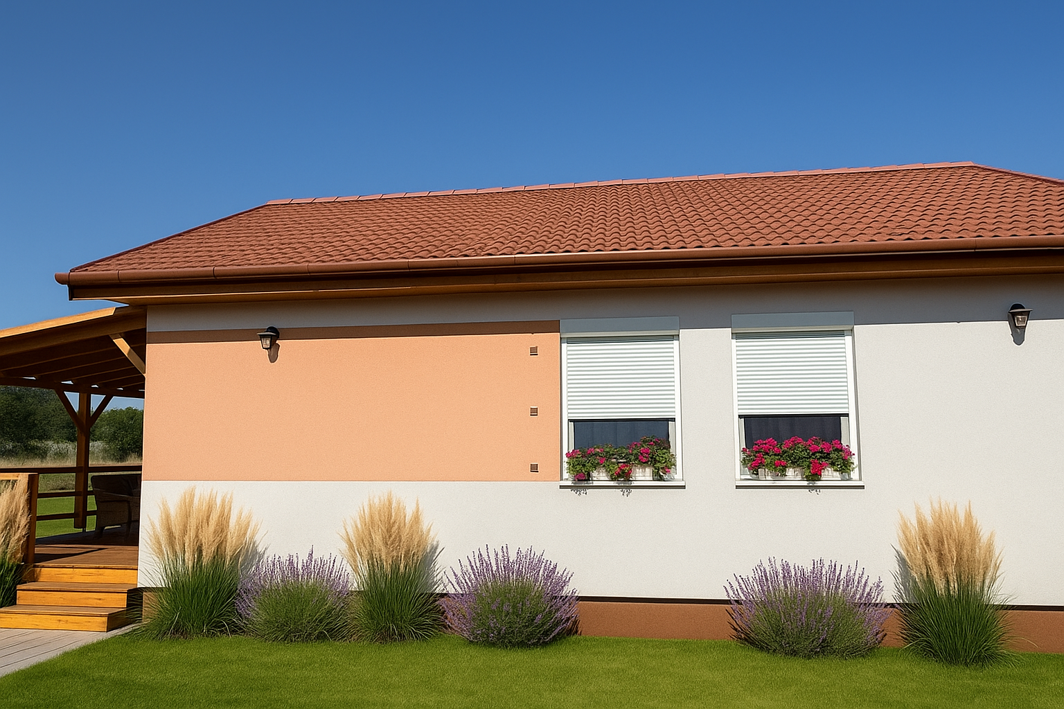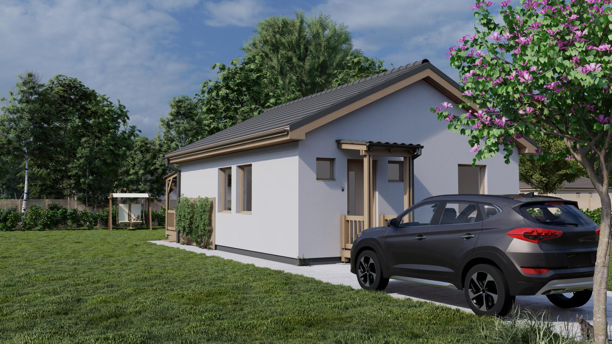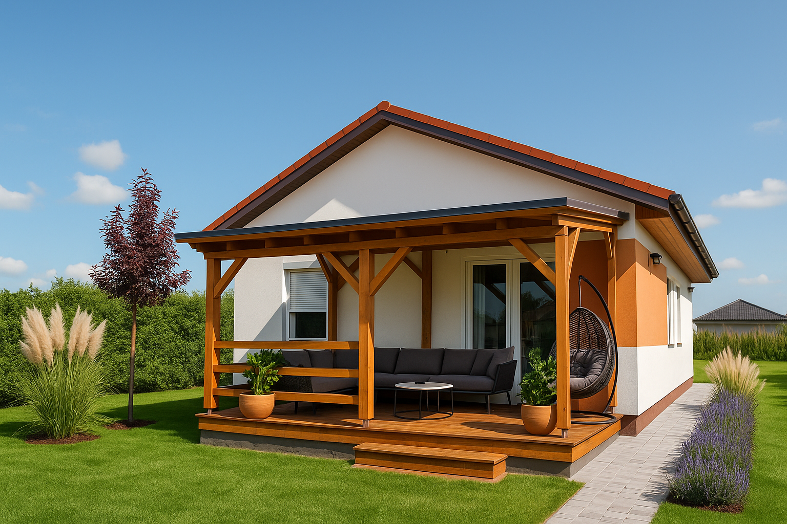 ✔ Fedett terasz az alapárban: Egy 5x3 méteres, faszerkezetű, cserépfedésű terasz is a csomag része.